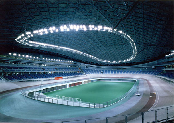 「北九州メディアドーム」(平成11年竣工)は、長軸205m、短軸142mの楕円形ドーム屋根の下に1周400mの自転車走路(バンク)が設置され、屋根付き競輪場としては国内最大規模となっています。 同時に、屋根を支持する躯体にCFT構造、客席にPC段床を採用し、短工期で竣工しました。