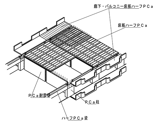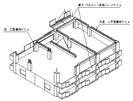 PCa工法とは、主に鉄筋コンクリート(RC)造において、在来工法では場所打ちとするコンクリートの一部または全部をPca工場で製造したPCa部材で構築する工業化工法です。